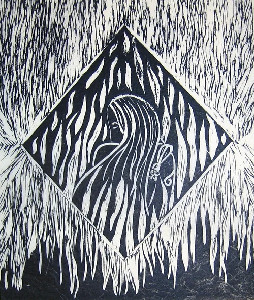 Chilman/Veil - Woodcut with lace & embroidery, 27" x 17 3/4"